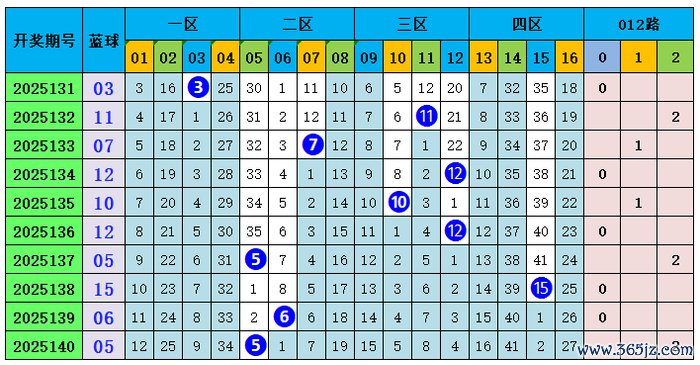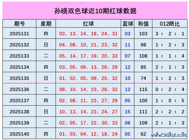 上期总结:双色球第2025140期开出奖号:红球01、03、04、12、18、24;蓝球05,其中红球和值为62,012路比为4:2:0,奇偶比2:4,蓝球开出小奇数号码05。
