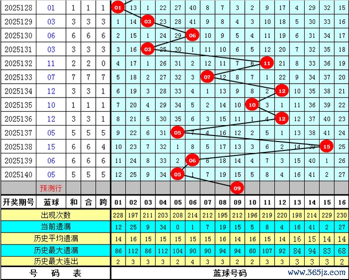 上期开出蓝球号码05,遗漏2期,为热码。现在蓝球遗漏值15以上的冷码有6个:02、04、08、13、14、16;遗漏值在7-15之间的温码蓝球有5个:01、03、07、09、11;遗漏值6以内的热码蓝球有5个:05、06、10、12、15。本期得当热心温码蓝球出现,参考蓝球号码:01、02、06、09、15。